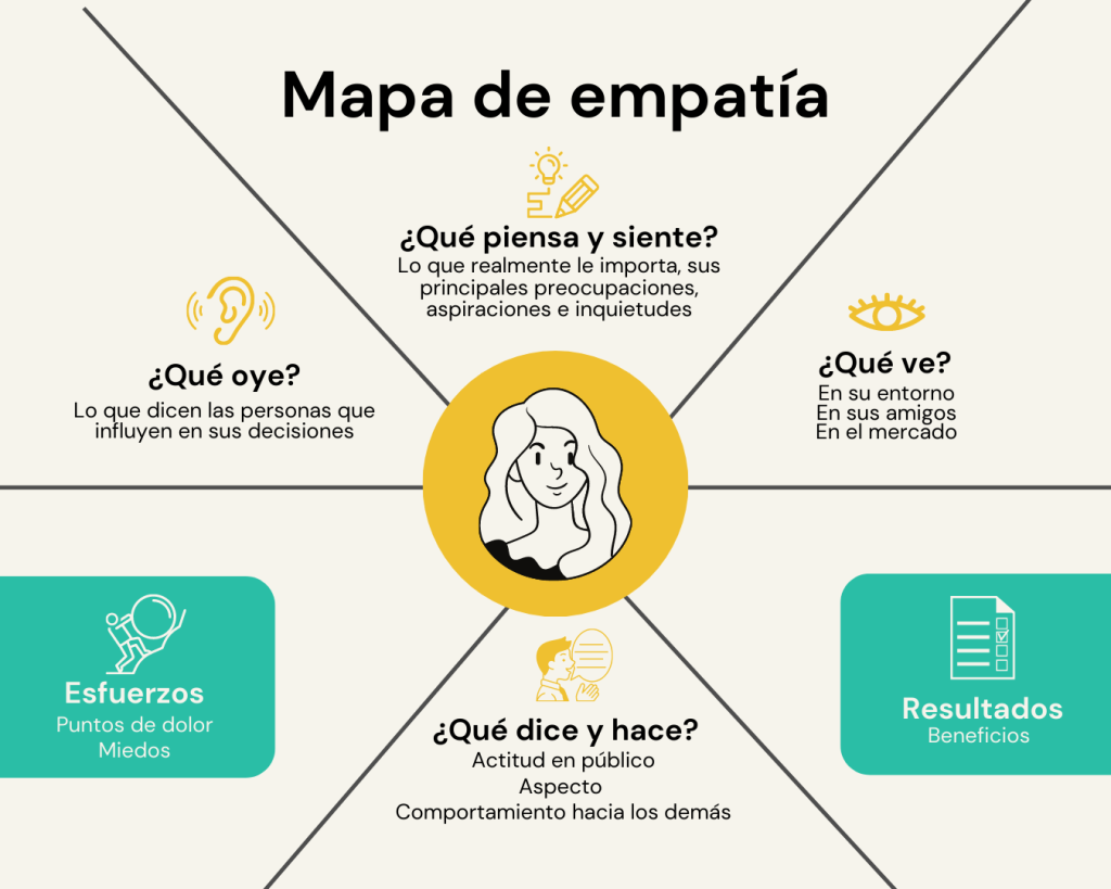 7. A qué personaje admiras y por qué.Claro ¡hay más! y todo depende de tu negocio, de tu empresa, de lo que necesites saber. Pero estoy segura que estas preguntas te servirán de guía. Los resultados siguen siendo HIPÓTESIS que con el paso del tiempo podrás comprobar o descubrir más a fondo cuando conoces a tu cliente.Existe una herramienta que a mi personalmente me encanta y es EL MAPA DE EMPATÍA. Seguro ya lo conoces. Y si no, te lo muestro a continuación.